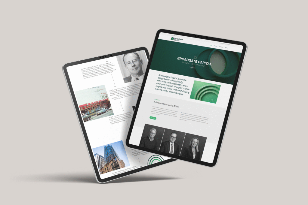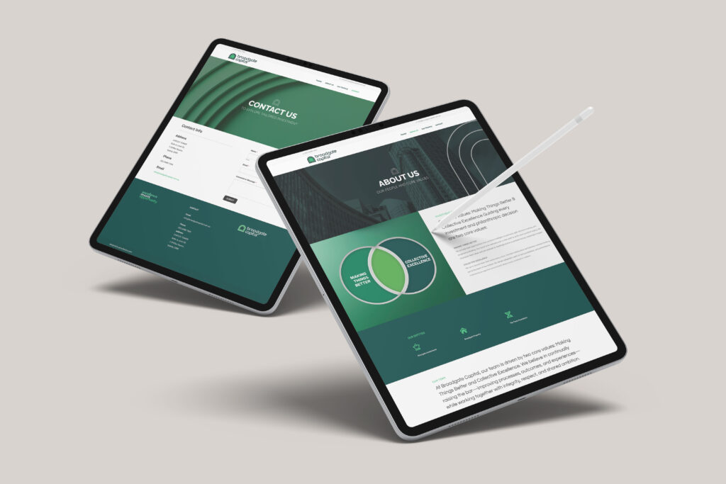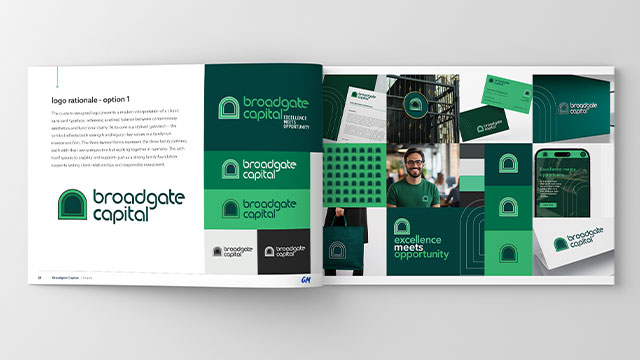 A unifying element of the identity is the arch imagery drawn from the logo. Much like a gateway, it symbolises strength, opportunity, and forward passage. This arch has been developed into flexible graphic devices that extend seamlessly across all brand touchpoints — from the website and marketing collateral to office interiors, signage, and printed materials. The result is a cohesive and instantly recognisable identity that reinforces Broadgate Capital’s values wherever it appears.